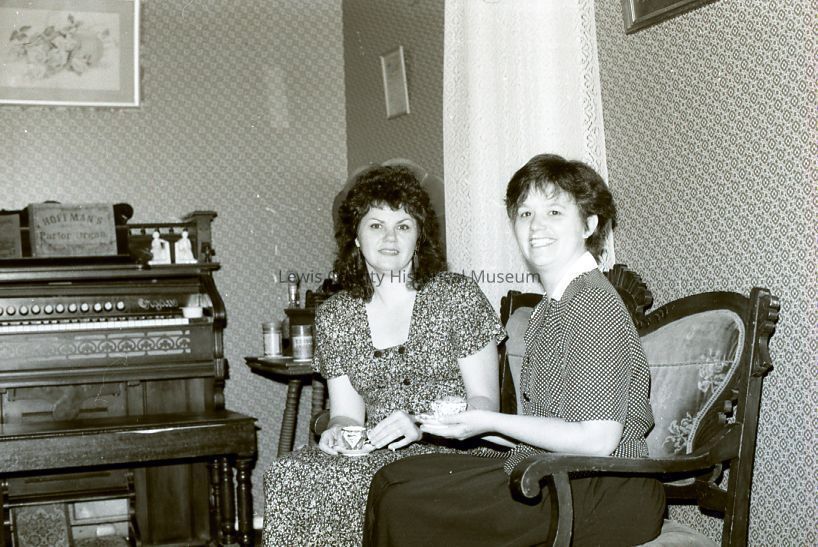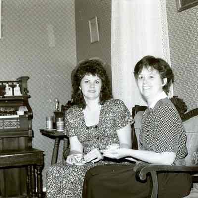 Two ladies having tea while sitting in old chairs. Have negative.Lexicon