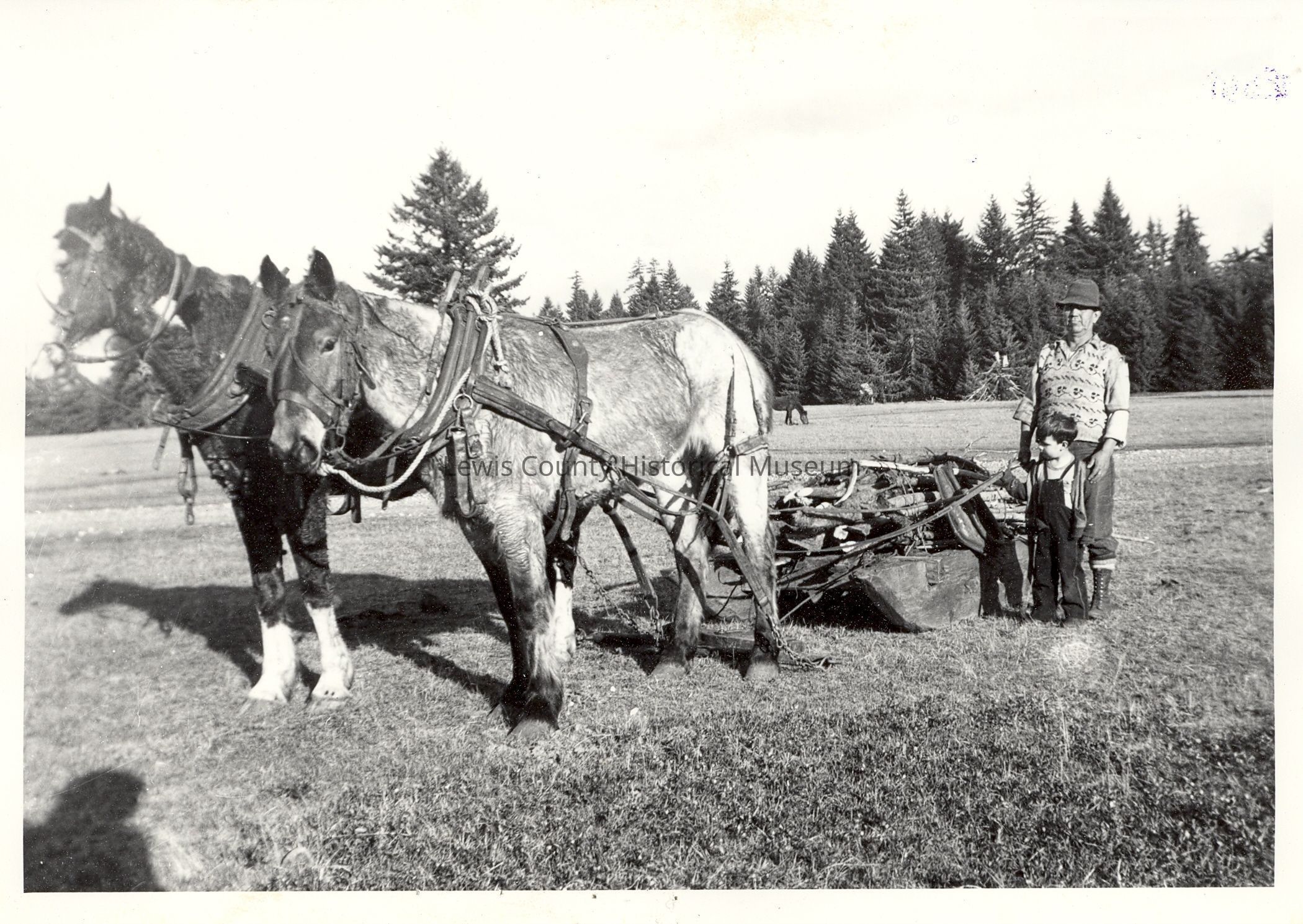 Chehalis Indian, Murphy Secena and his son. Shows a team in harness, a horse and a mule, pulling a sled of logs. Taken in a clearing surrounded by trees. Original filed in the Indian books. Have negative.Lexicon