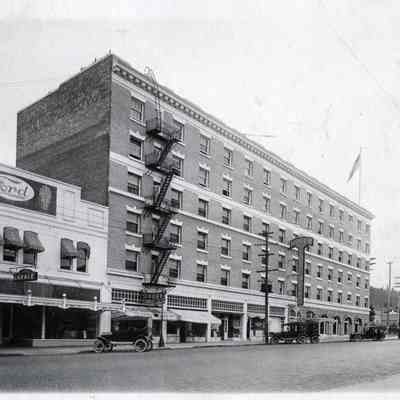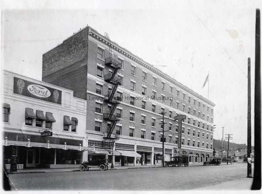 Excellent view of the exterior brick structure of the St. Helens Hotel and St. John's Ford Garage on Market Street, Chehalis, WA. Taken in 1921. Streets are brick. Some Model A's in the foreground.Collection
