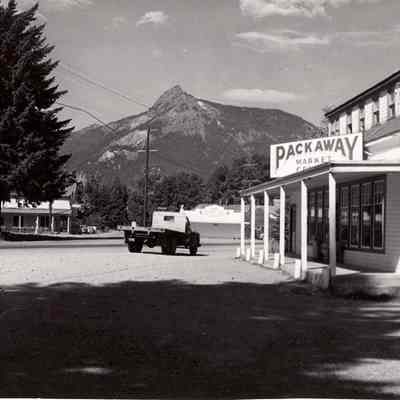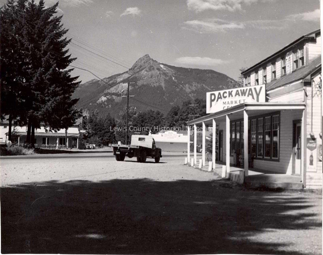 Scene of main street, Packwood, WA. Showing the Packwood Market on one side and the old Packwood Hotel on the other side. A flatbed truck parked near the market. Mountain peak in the background. This main street is also Highway 12, White Pass or Mt. Highway. Have negative.Collection