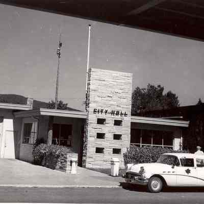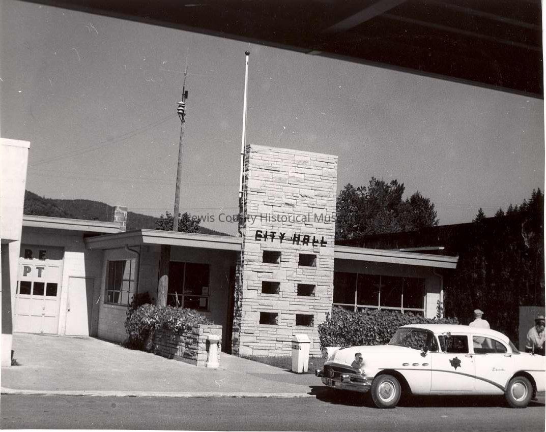 Morton, WA. City Hall & Fire Department, modern one story building of masonry and cement block. Morton official car which is a 1953-55 model Buick. Unidentified men. Have negative.Collection