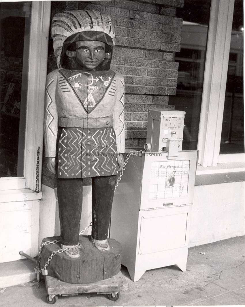 Cigar Store Indian by the door of the St. Helens Hotel, Chehalis, WA. Chained to the newspaper sales box. Indian is almost lifesize, hand carved wood, has a feather head dress, decorated shirt, long pants and mocassins standing on a block of wood. Located now at the LCHM. Have negative.Collection