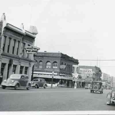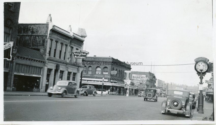 Chehalis, WA Market Street, looking NW. Note Cooke's Jewelry Clock on right and Burnett's Jewelry Clock on left. 1939Collection