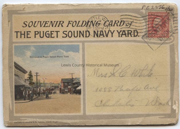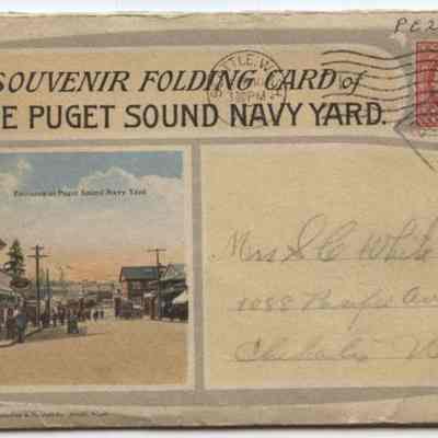 Puget Sound Navy Yard folder of 20 colored cards sent from Seattle to Mrs. S.C. White, 1088 Pacific Ave, Chehalis, WA, dated April 10, 1938. 2¢ stampLexicon