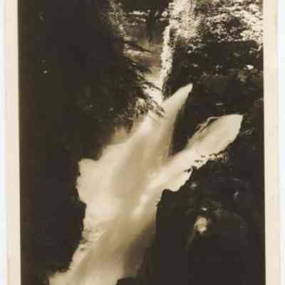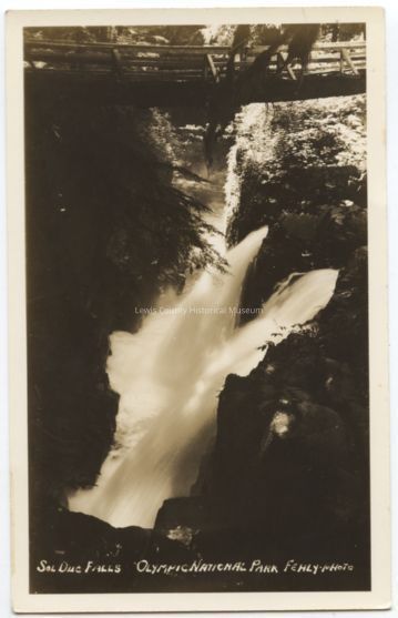 Black & White postcard - Sol Duc Falls in Olympic National Park, WA. Foot bridge crosses falls.Lexicon