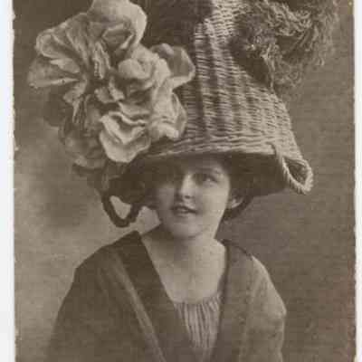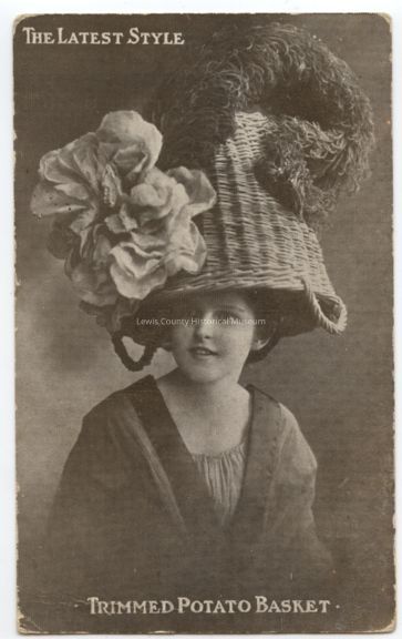 Sepia tone postcard - The latest style, young lady wearing a trimmed potato basket hat. Postmark: Sep 1, 1909 at Walla Walla, WA. 1¢ stampLexicon