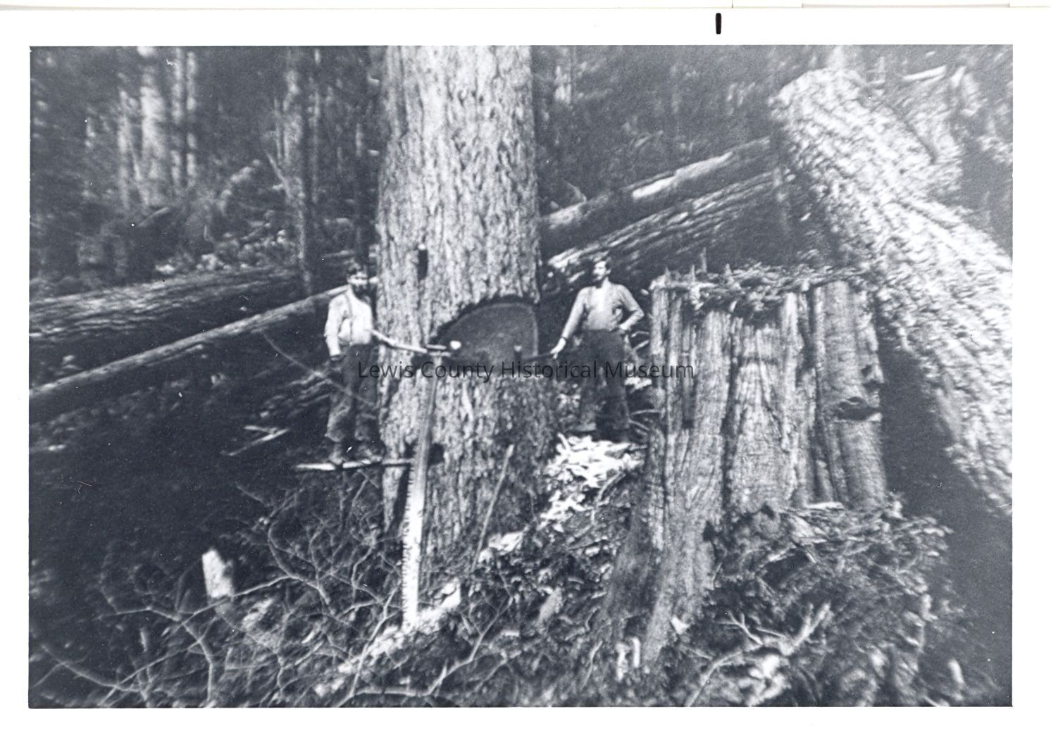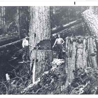 Ezra Blankenship and R. Jonah Blankenship, circa 1930, falling a huge fir tree . Large cedar stump next to fir tree. Have negative.Lexicon