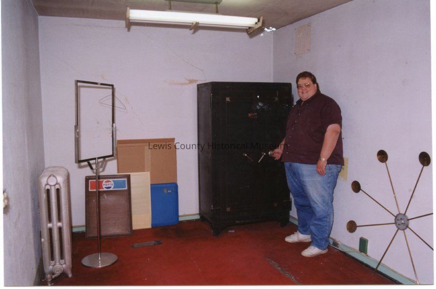 Chehalis Theater giant safe in manager/owner's office; Daryl Lund. Photo by Ken Layton, 7/3/1994.Collection