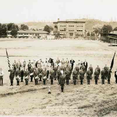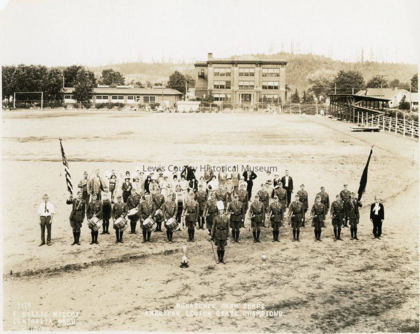 Photo of the Wenatchee Drum Corps, American Legion State Champions on the Centralia High School football field August 10, 1928. In the background is the High School Bldg. The shop or bus garage is on the left.Collection