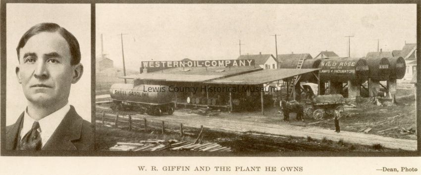 Western Oil Company, located at State and Wrangle Streets, was distributor of Wild Rose Oil for lamps and incubators, Shell gasoline and Overland, the famous auto oil. Man standing near railspur and portrait are of W. R. Giffin, plant owner and manager. Photo from May 1915 Historical Edition of the Chehalis Bee Nugget.Collection