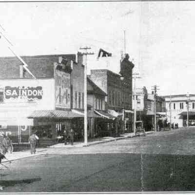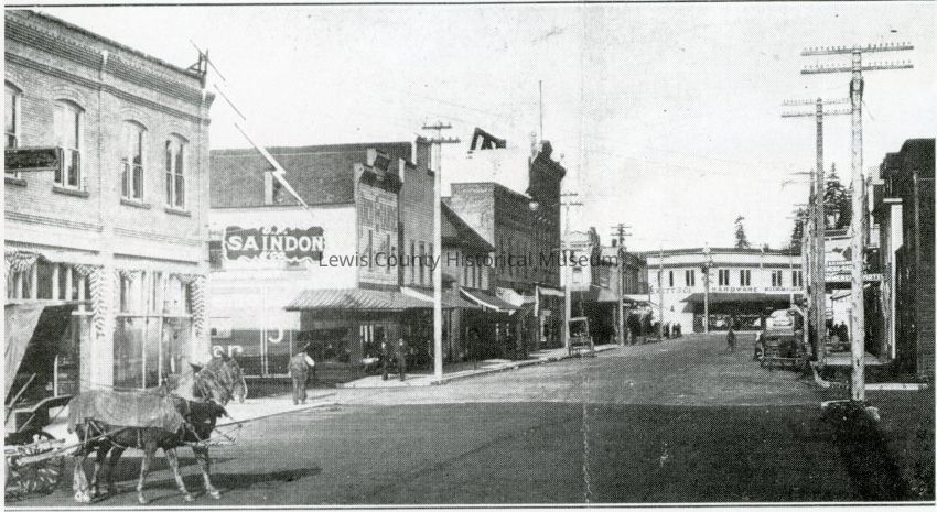 Chehalis Avenue in 1909 shows the Saindon Building; four buildings no ID, Brunswig's Opera House at corner of Park Street, no ID on next few buildings, then Everett & Co. Hardware at NW corner of Pacific, Boistfort and Chehalis Avenues.Collection