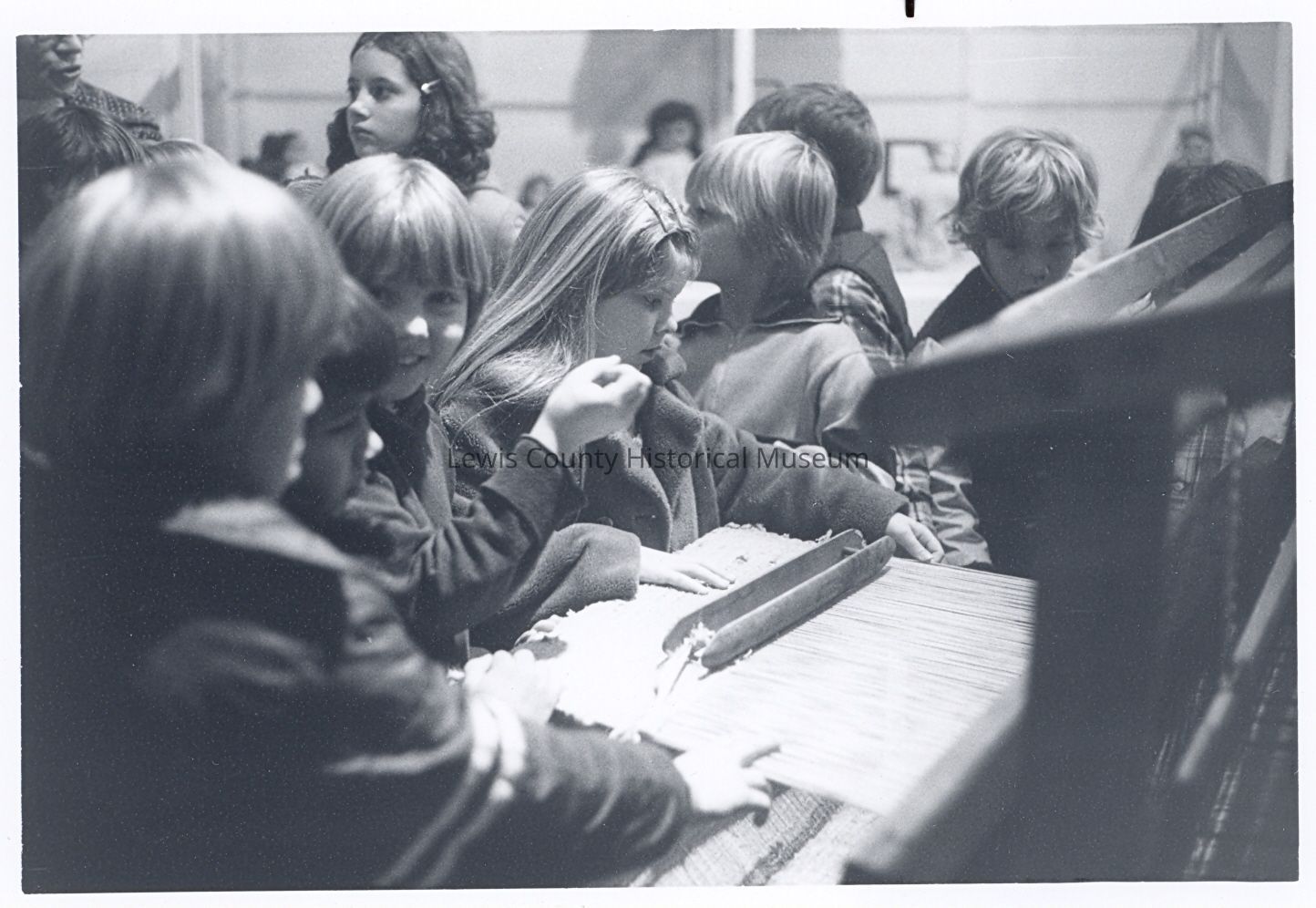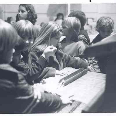 3rd grade tour group viewing a 45' floor loom at LCHM Dec. 1979 Have negative.Lexicon