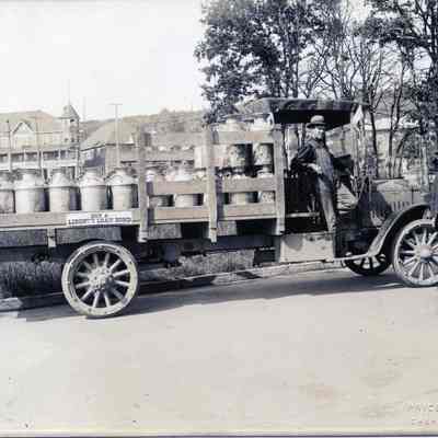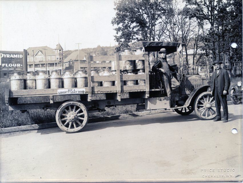 Milk truck, driver unknown, Harry B. Quick to the right; on Whitworth Way, back of the Presbyterian Church. St. Helen Hotel and library are seen in background. Truck was purchases from Harry B. Quick Agency. Note: Liberty Bond indicates this was during WWI. Geislers Bldg. and Park St. has Pyramid Flour sign. ca. 1917Collection