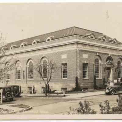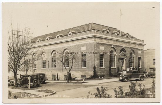 Black and White Postcard. Chehalis Post Office at top of Cascade Avenue, built ca 1935, donor Fran Wilson, Yelm, WA, October 24, 1912. 2012.56.1Lexicon