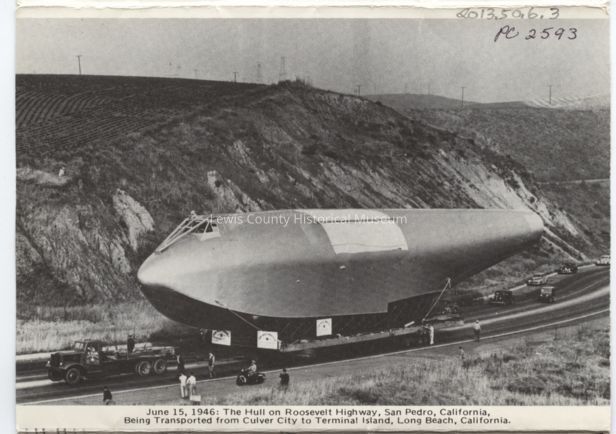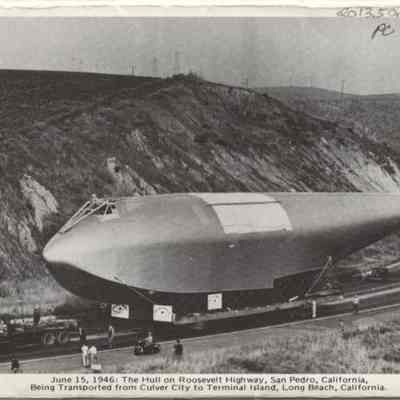 June 15, 1946: The hull of the Spruce Goose on Roosevelt Highway, San Pedro, CA being transported from Culver City to Terminal Island, Long Beach, CA, black and white. 2013.50.6.3Lexicon