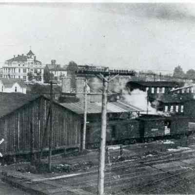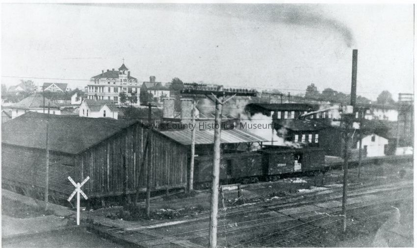 Photo of the area west of the railroad tracks at Prindle Street. Large 3 story building is the Holy Rosary Academy which opened in 1895. It was a boarding and day school conducted by the Dominican Sisters for grades one through eight. It continued until 1918 when the location became undesirable because of the nearness to the railroad. The buildings in the foreground is where Palmer Lumber Company was later located. Chehalis, WA ca. 1909 Have negative.Collection
