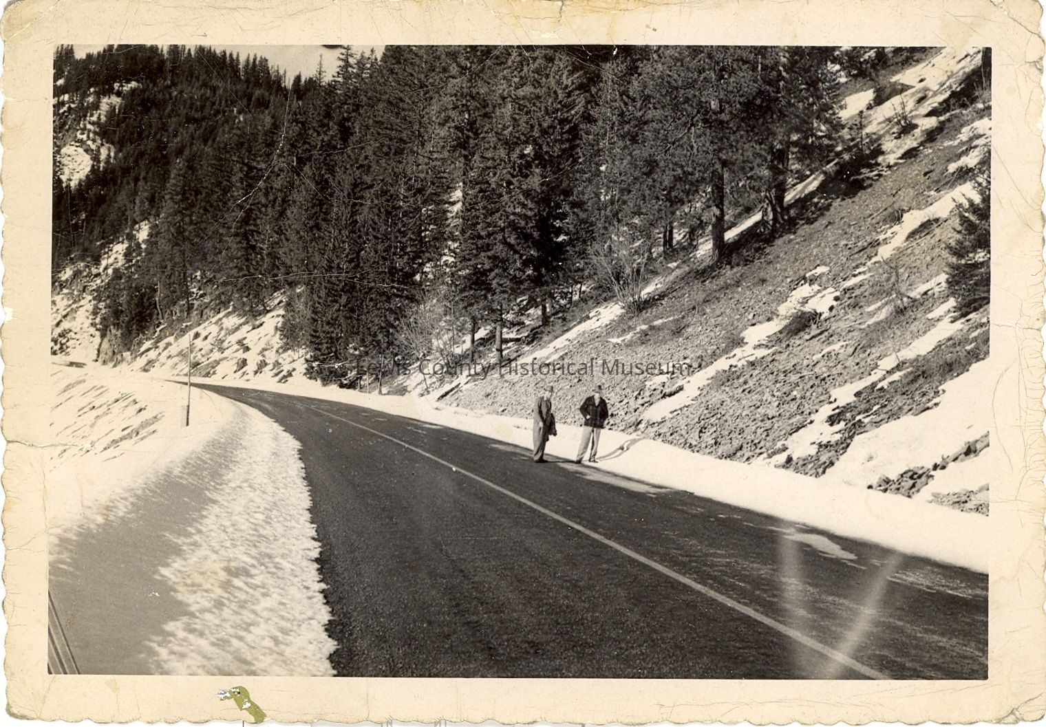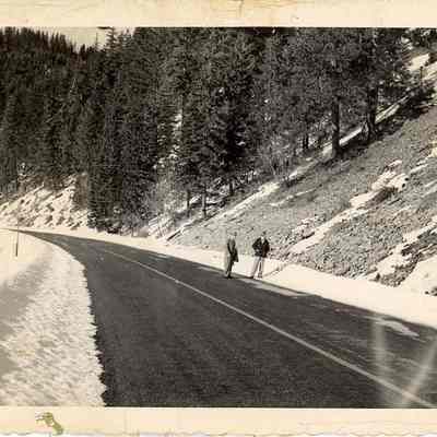 East side of White Pass just above Clear Lake, WA. Dec.11, 1951. Shows highway cleared of snow, 2 men on the road.Collection