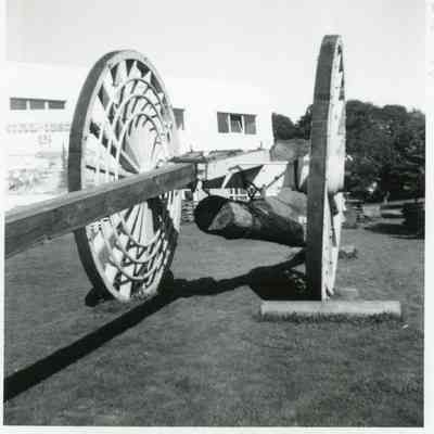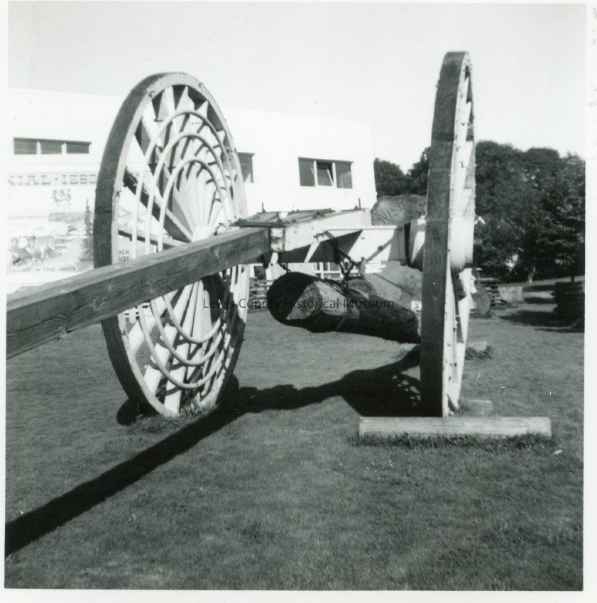 High wheeled log carrier, part of Paul Bunyan oxen display, Civic Center, Chehalis, WA, 1953.