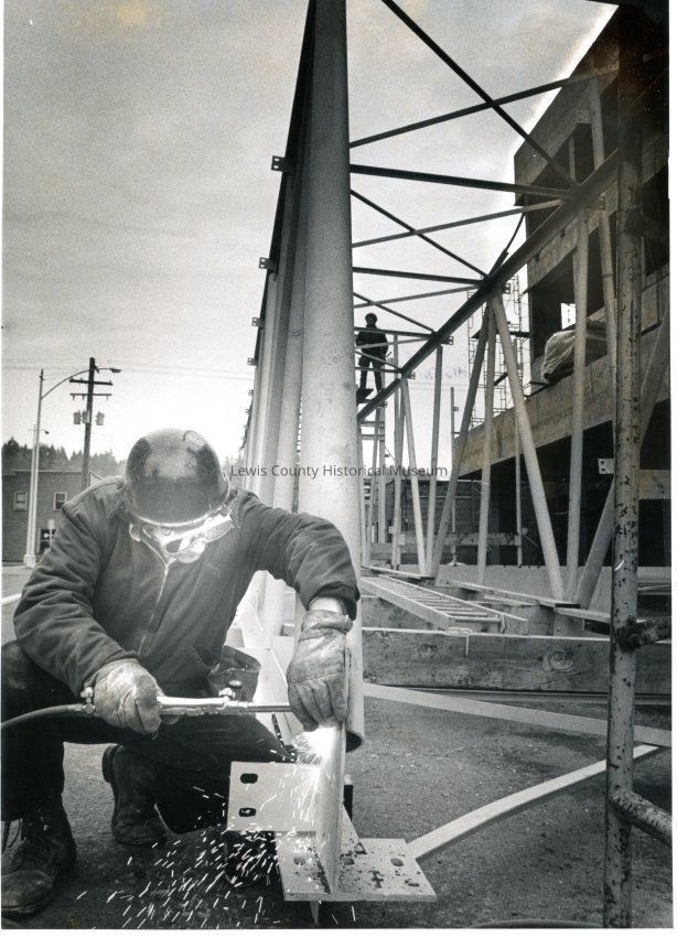 1977 photo of Jack Markham a welder with B-D & L Construction Company. Jack is welding part of the skybridge.