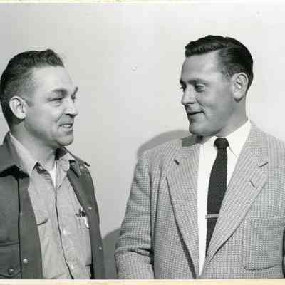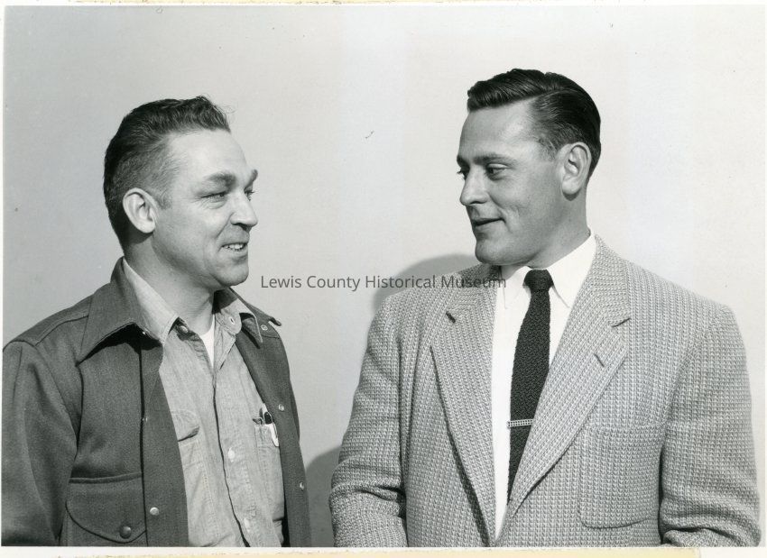 Ag chairmam George Osborne on left and Ray Hayes Jr., the Cowlitz Dam chairman of the Chehalis Adventure, also known as Chehalis Community Development. 1954.Collection