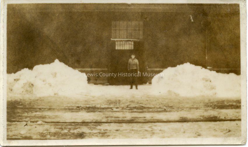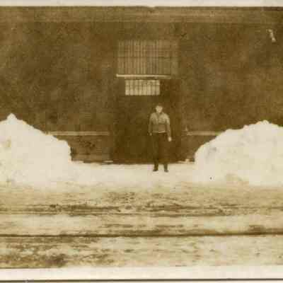 One of the workers at the Chehalis Railroad Depot, in a snow scene. Snow is mounded up to about 4 1/2 to 5'. Have negative.
