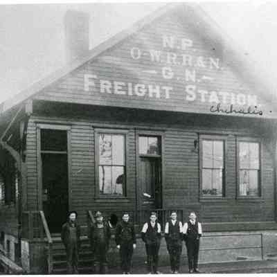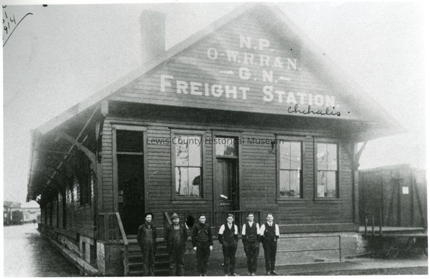 Chehalis N.P., O-W.R.R. & N. and G.N. Freight Depot in Chehalis, WA. William Dow Hoyt is first from right, worked as a freight clerk here from 1914 to 1920. Photo Dec. 31, 1914. Have negative.Collection