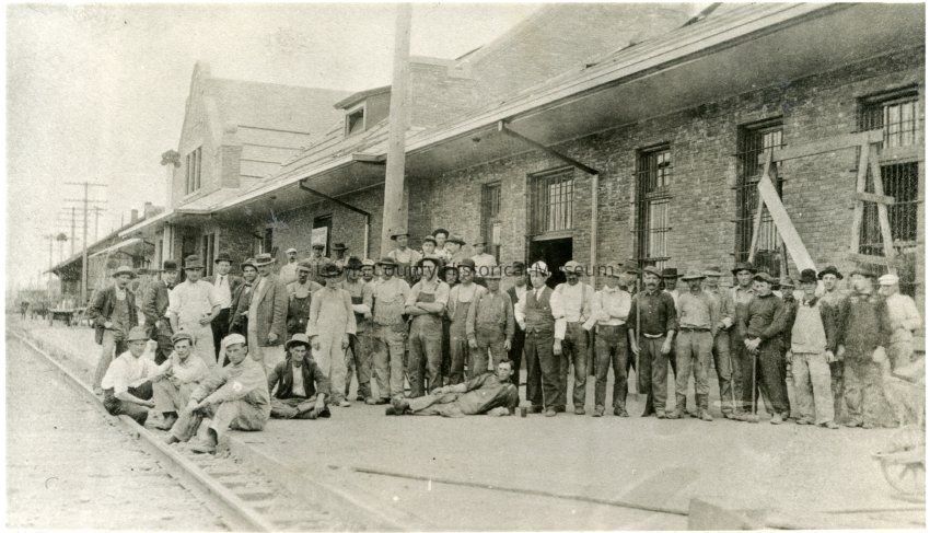 Construction crew in front of NP Depot during final work on building in 1912. Photo taken from track side looking northward. Old station still stands at south end and was razed at a later date. Have negative.