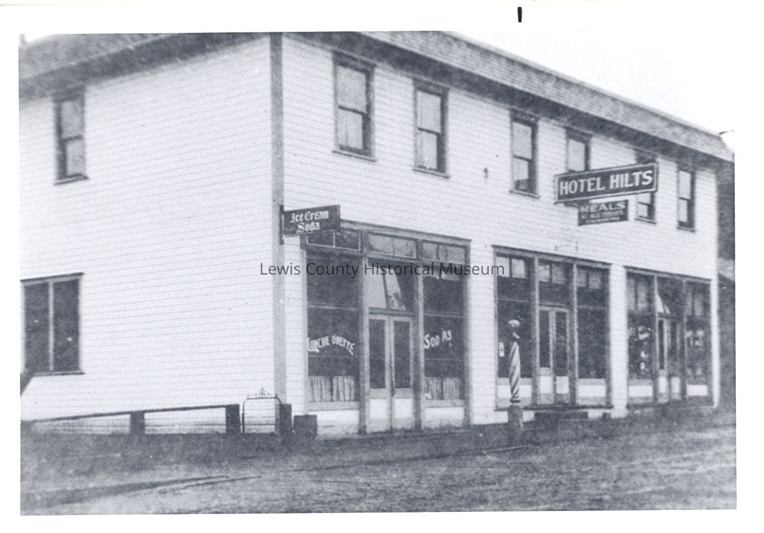 Morton Hotel Hilts, 1920. This hotel even had a gambling room. Shows the outside front of the hotel, cafe, and barber shop pole. Dirt streets in front. Have negative.Collection