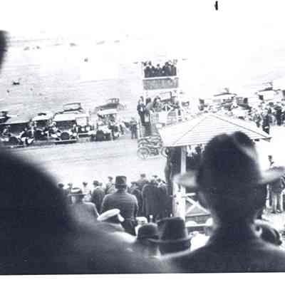 SWW Fairgrounds motorcycle races, 1916. Shows old cars parked in the background. Shows starting line and judging stands. Taken from the grandstand. Have negative.Collection