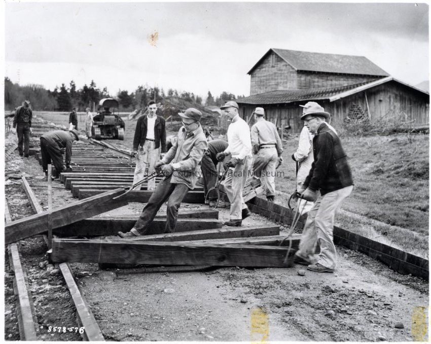 Photo showing a group of men building a rail spur into the Chehalis Industrial Park, Chehalis, WA, 1958.Collection