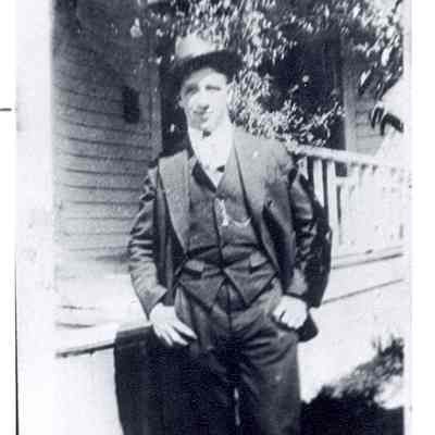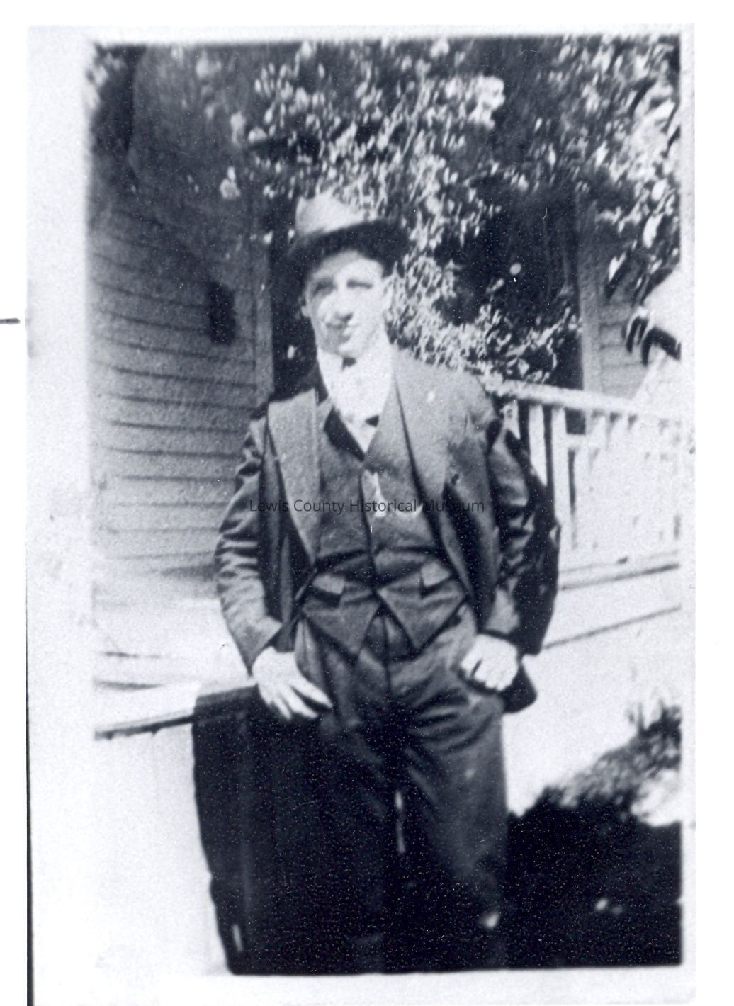 Eugene Fitzer standing in front of the Kuehner home in Chehalis, WA. (he was shot during the Centralia massacre). Have negative.Collection
