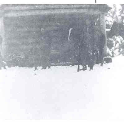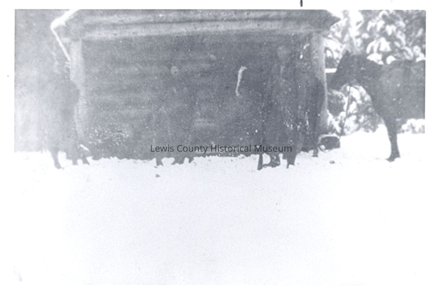 Hunting party in the snow at Packwood, WA by a Forest Rangers cabin. Shows horses, circa 1920. very faded photo. Have negative.Collection