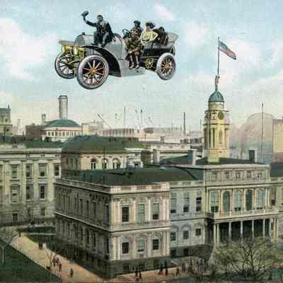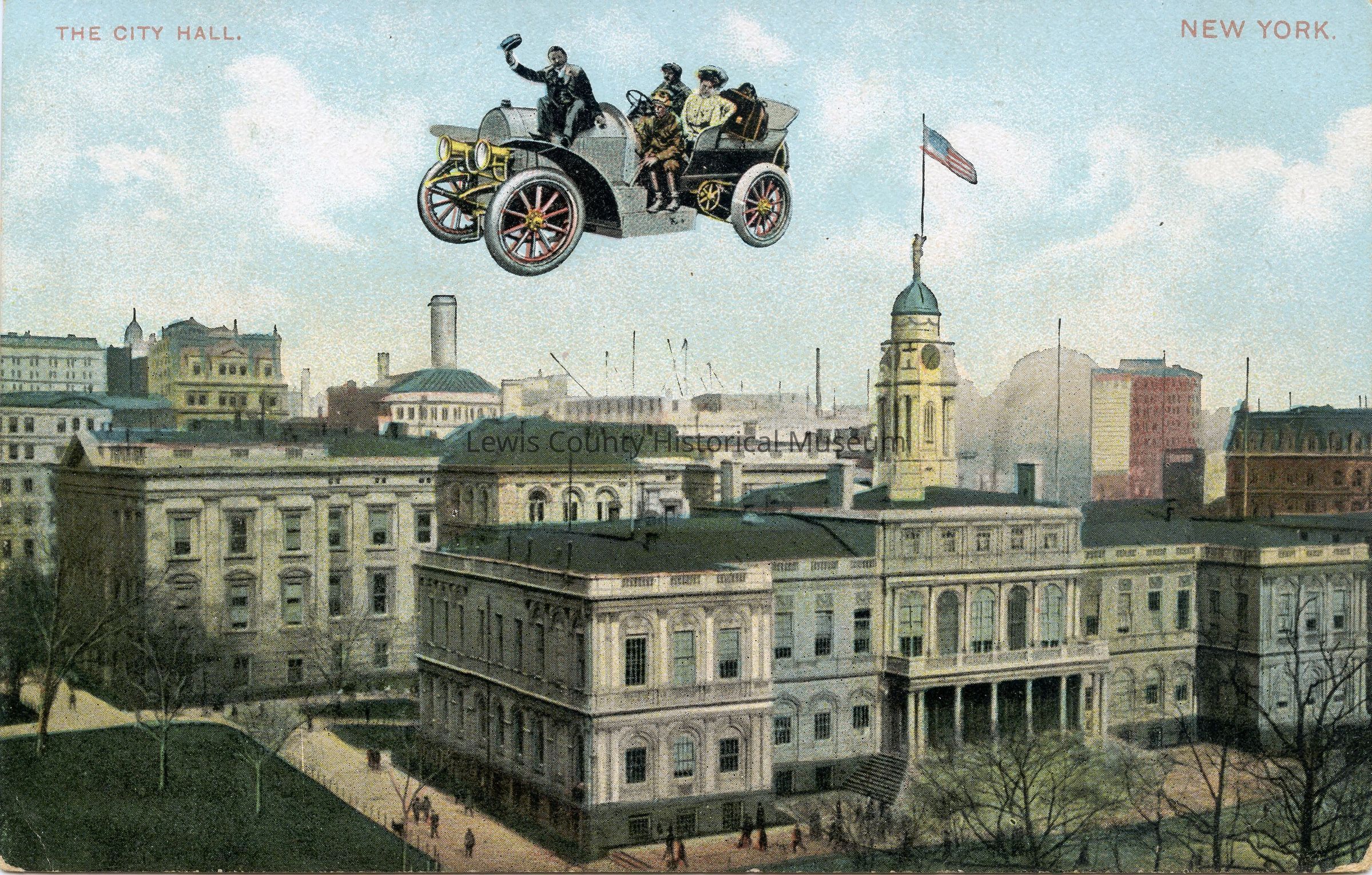 Car flying over the City Hall in New York.