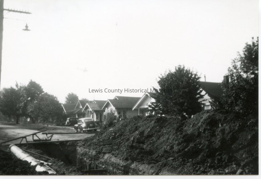 Chehalis, WA - Prindle St. sewer project. Picture taken in front of Myrtia Brights home at 768 Prindle, ca. 1947. Have negative.Collection