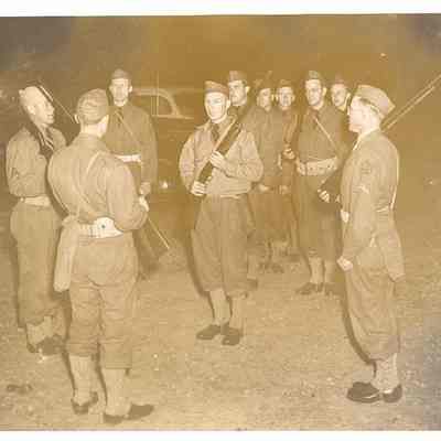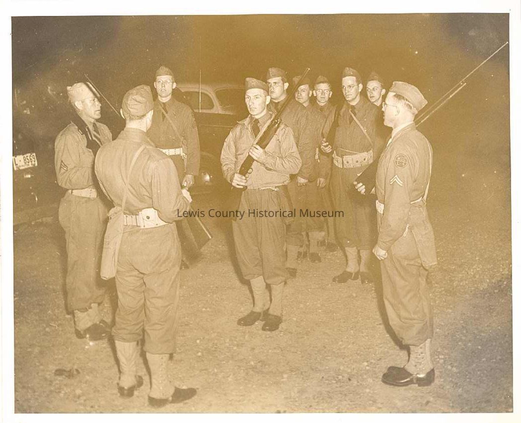 Photo of National Guard at the Armory. Present arms, L to R: facing forward:______, Walter Wagner. Centralia,WA. circa 1943.Collection