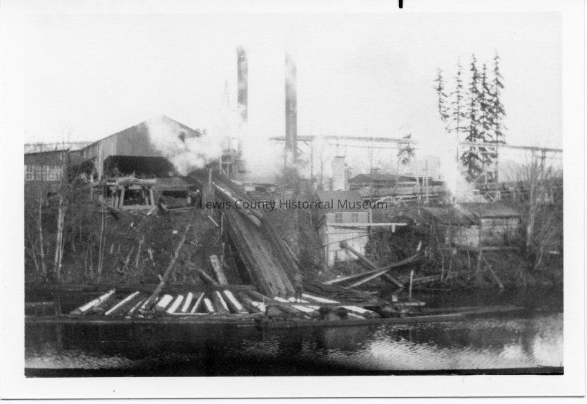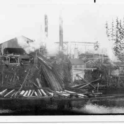 Unidentified Lumber Mill. Could be one in Bunker Creek. Good photo showing Mill, pond and logs. Have negative. Have slide.