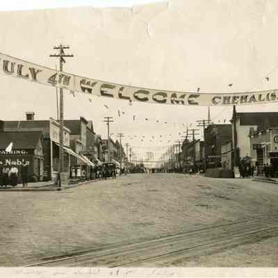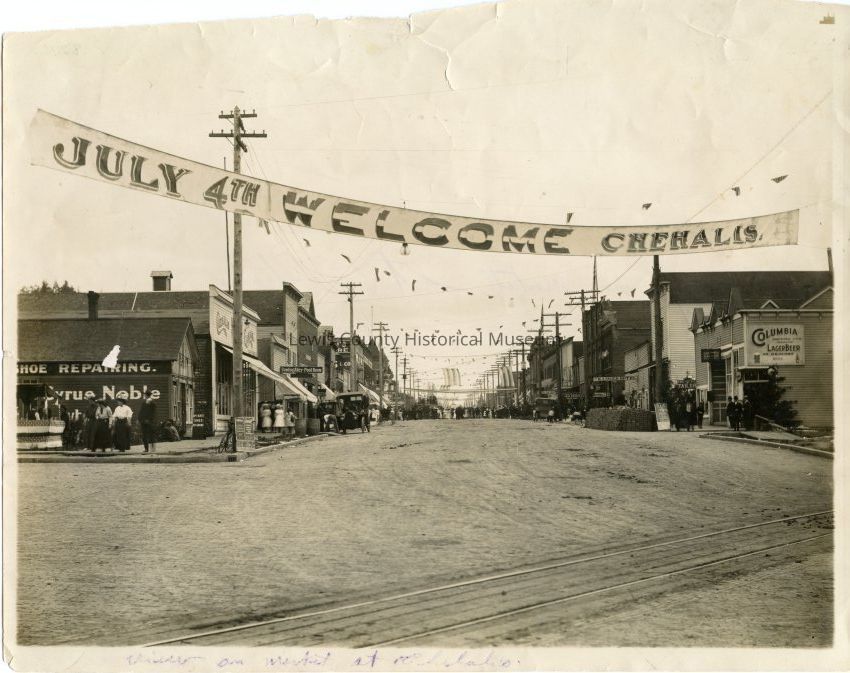 View of Market Street in Chehalis, WA showing many of the buildings. Brick streets with July 4th Banner. Shows Cyrus Noble Shoe Repair, Chehalis Garage, Bowling Alley & Pool Room, Bakery, Real Estate Office, Rainier Hotel, Karl Teitzel Tailor Shop and Columbia Saloon. Circa 1912 as there is a large pile of brick on the right and that is when the streets were being bricked. Have negative.