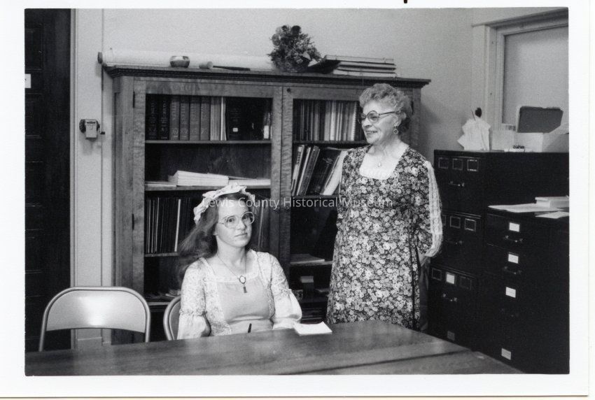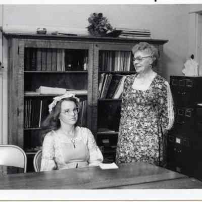 L-R Loretta Jones and Margaret Shields in Library at Grand Opening of Lewis County Historical Museum. Sept. 18, 1979. Have negative.Lexicon