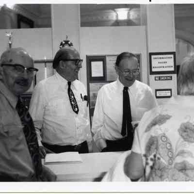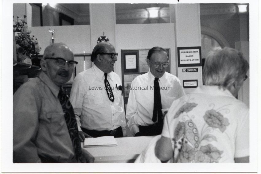 Information Desk at Grand Opening of Lewis County Historical Museum. L-R Orville Behrbaum, Jim Backman, Don Bunker and Maude Behrbaum. Sept. 18, 1979. Have negative. Have Slide.