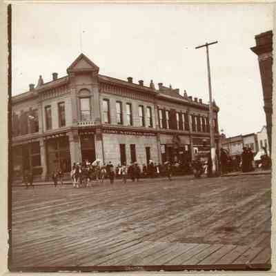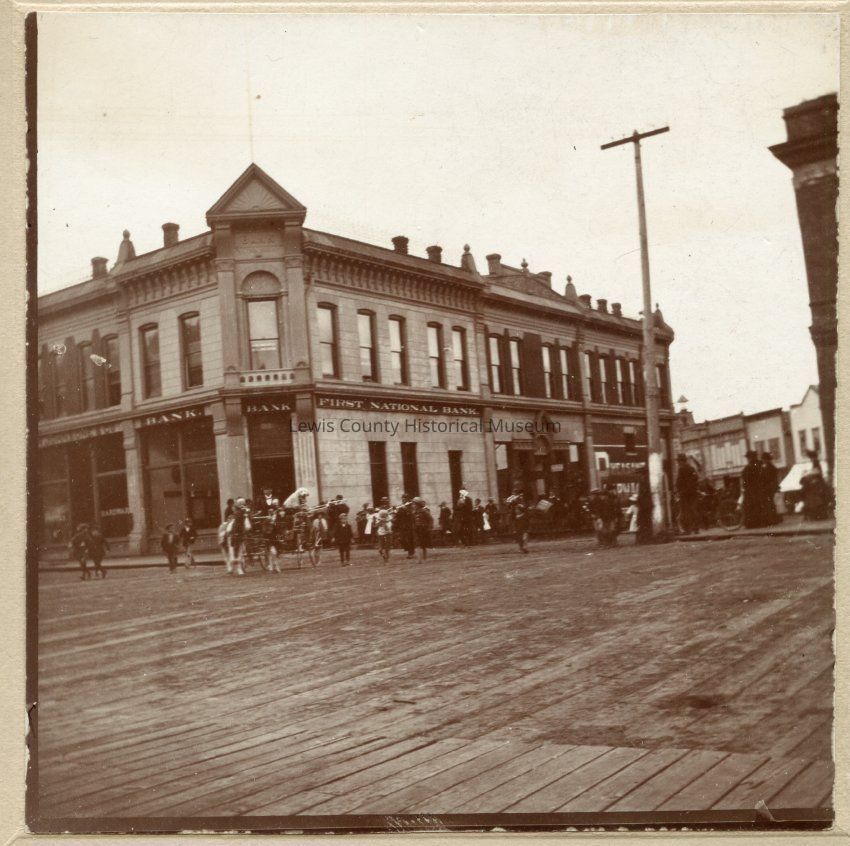 Corner of Market and Boistfort looking south toward Coffman Dobson Bank. Plank street, Uncle Tom's Cabin with parade lining up in street, Chehalis, WA.Collection