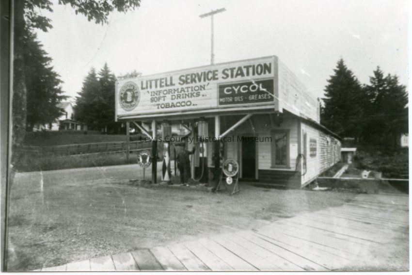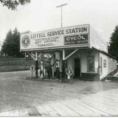 In about 1927 Lewis Lund put in the Littell Service Station, on the end of a row of garages earlier used by the Snow Lumber Co. Bernie Smith purchased the station from Lund. The garage building and station were torn down, then the old RR Depot was moved onto the site and was used as a Grocery, Post Office, Service Station and Residence in the 1930's. Have negative. Have slide. Littell Slide Tray