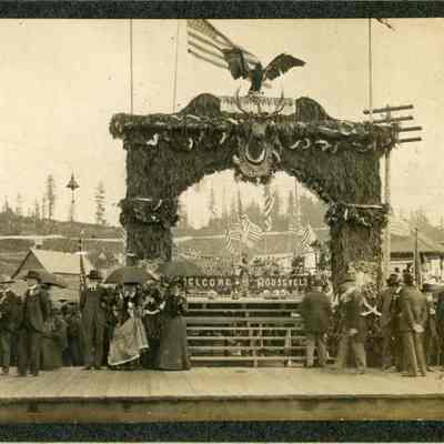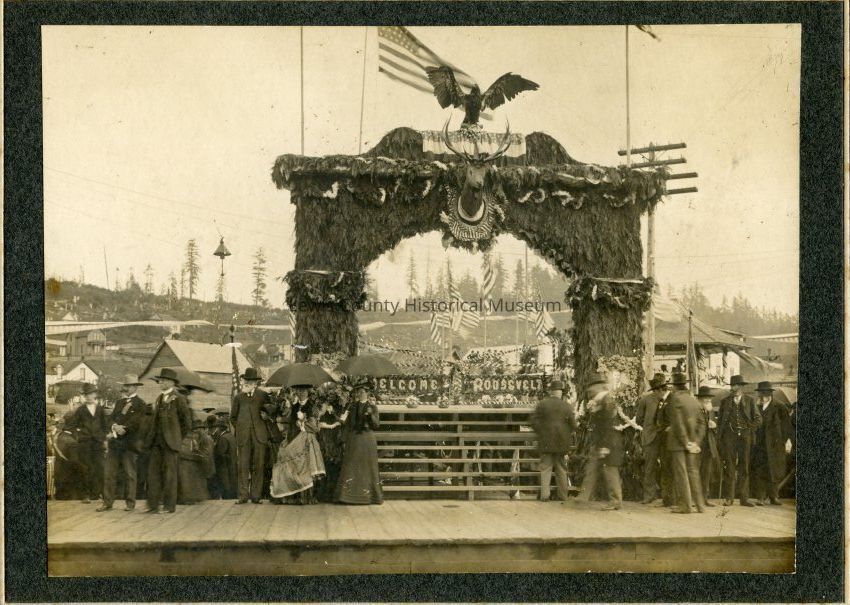 Chehalis, WA greeters awaiting the arrival of President Theodore Roosevelt, May 22, 1903, to speak from the McKinley Stump. The hillside east of Chehalis, WA can be seen.Collection