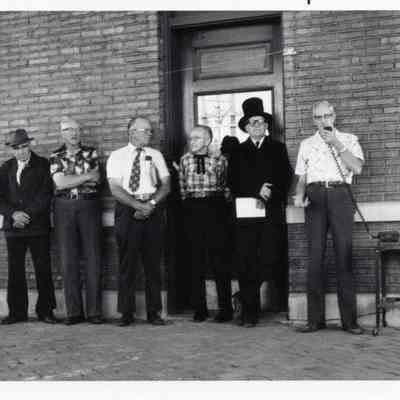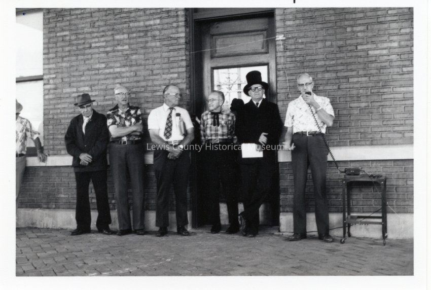 Speech group at Lewis County Historical Museum Grand Opening at door entrance to Chehalis Depot. L-R: William Raupp, Harlan Shepardson, Bob Nix, Carl Dickey, James Backman (all Board Members of Lewis County Historical Society) and County Commissioner Harold Cooper. 9-18-79. Have negative. Have slide.