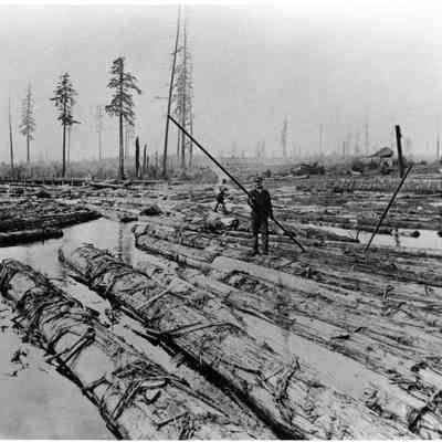 Log pond men picking and moving logs about with pike poles. Note edge of pond in background where the Cedar logs were inloaded from flat cars at the Snow Lumber Co. Mill at Littell, WA in 1920's. Have negative. Have slide. Littell Slide Tray
