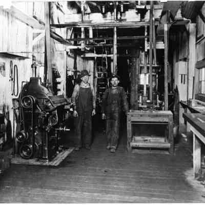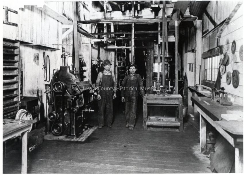 The planing at Snow Lumber Co. Mill, Littell, WA. Sharpening machine and is powered by belt running through the ceiling. ca. 1920's. Have negative. Have slide. Littell Slide Tray