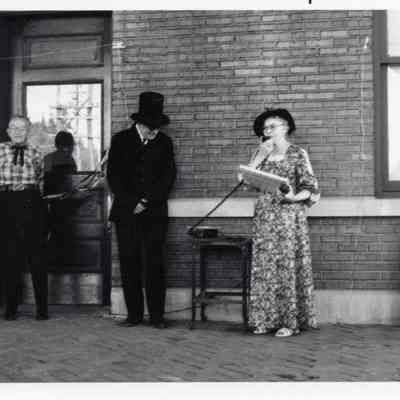 Grand Opening ceremonies of Lewis County Historical Museum at Chehalis Depot, Sept. 18, 1979. L-R: Bob Nix, Carl Dickey, Jim Backman presenting plaque to Margaret Shields for exceptional volunteer efforts. Have negative.Lexicon