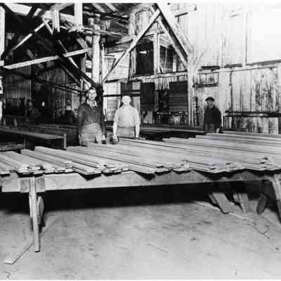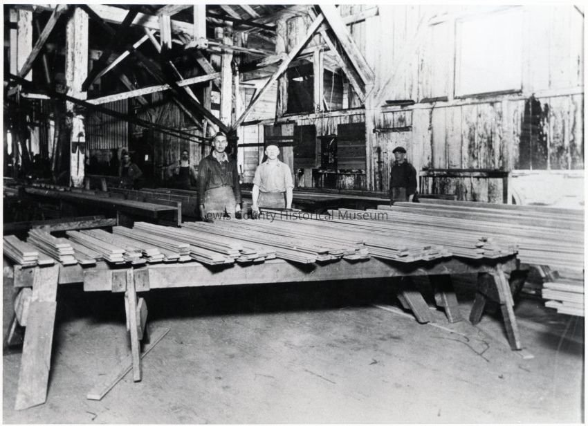 Behind the "matcher" the finished lumber was trimmed, graded and tied into bundles. Man at left wearing a beanie cap is Carl Lund. Snow Lumber Co. Mill, Littell, WA ca. 1920's. Have negative. Have slide.