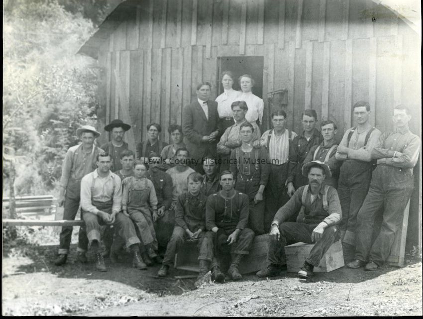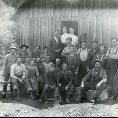 Photo of Lumber Crew standing and sitting in front of frame building. Unidentified camp. Have slide.