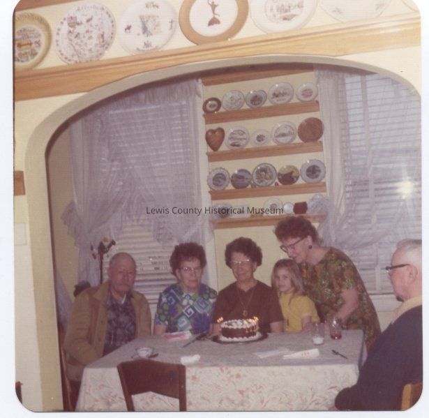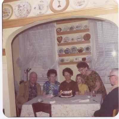 Bernice Sweeney (Sweany) Roundtree preparing to cut birthday cake with family around, ca. 1970s, color print, Burke collection, 03.22.Collection