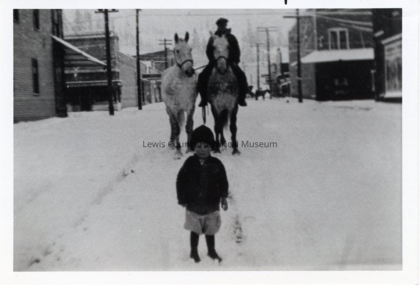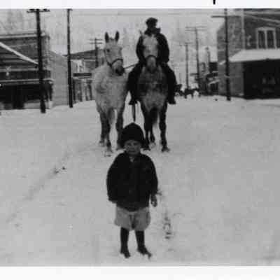 Chehalis Fire Department horses Deg and Prince being exercised by Cark Kallihan down the streets in Chehalis, WA. Snow on the ground. Shows Trolly tracks in the snow. Little boy, Clyde Truett, in the foreground. Circa 1910. The horses were taken around the block several times each day for exercise.Lexicon